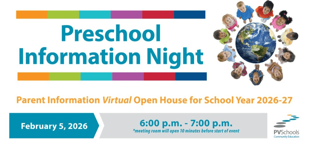Welcome to PVSchools Community Education 2026-27 School Year Registration Opens February 9, 2026 @ 8:00 AM Sign up for our Preschool Information Night! Early Childhood Development CentersLil Pioneers and Little Cubs program for children ages infant to 3 years old Early Childhood ProgramsPreschool and PreK programs (including Montessori and Gifted) for children ages 3-4 years old Mascot ClubBefore- and After-school carefor children in PreK-6th grade Find the right Early Childhood Program for Your Child Important Registration InformationContract approval is a two-step process, and all steps must be completed prior to placement. Submit an Eleyo Contract If it is your child's first time in our childcare programsCreate an accountIf your child has been in our childcare programs previouslyLog in to your existing accountSpace is limited and contracts will be approved on a first come - first served basis. Submit Required Documentation(choose one of the following options). Submit online (must be logged in to your Google account): Document Submission FormEmail as PDF or image files to community-ed-registrars@pvschools.net.Submit forms and documents in-person to: PVSchools Community Education 15032 N. 32nd St. Phoenix, AZ 85032 Copy of original state-issued birth certificate*, current immunization records, both parents' government issued photo ID, proof of residency** (i.e. lease agreement, utility bill, etc.) and custody paperwork (if applicable) with case number and court seal must be on file at the PVSchools Community Education office before your contract can be approved. *Only for those interested in our early childhood programs including Lil Pioneers and Little Cubs**Only for those interested in our Early Childhood Academy pre-kindergarten program 2026 Spring Enrichment Enrichment classes offer students opportunities to pursue interests, enhance abilities and talents, and engage in higher-level thinking. Classes are offered before and after the traditional school day and help to expand each student's social, emotional, physical, academic, and imaginative growth. View our 2026 Spring Enrichment Catalog Family Resource Center Do you have a child who’s five-years-old or younger?If so, our district provides cost-free programs and resources to help parents raise their young children in the first five years of life to prepare for a successful educational future. View our Calendar of Available Classes Get in TouchIf you have any questions feel free to contact us.Office hours: Monday - Friday8:00 a.m. to 4:30 p.m. Contact Us